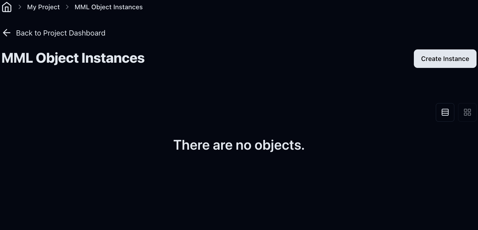 Let's go back to the platform and create a basic MML Object. To do so, click on MML Objects Instances on the menu to the left, then click Create Instance. A modal will appear. Enter your object's name and click on Create.