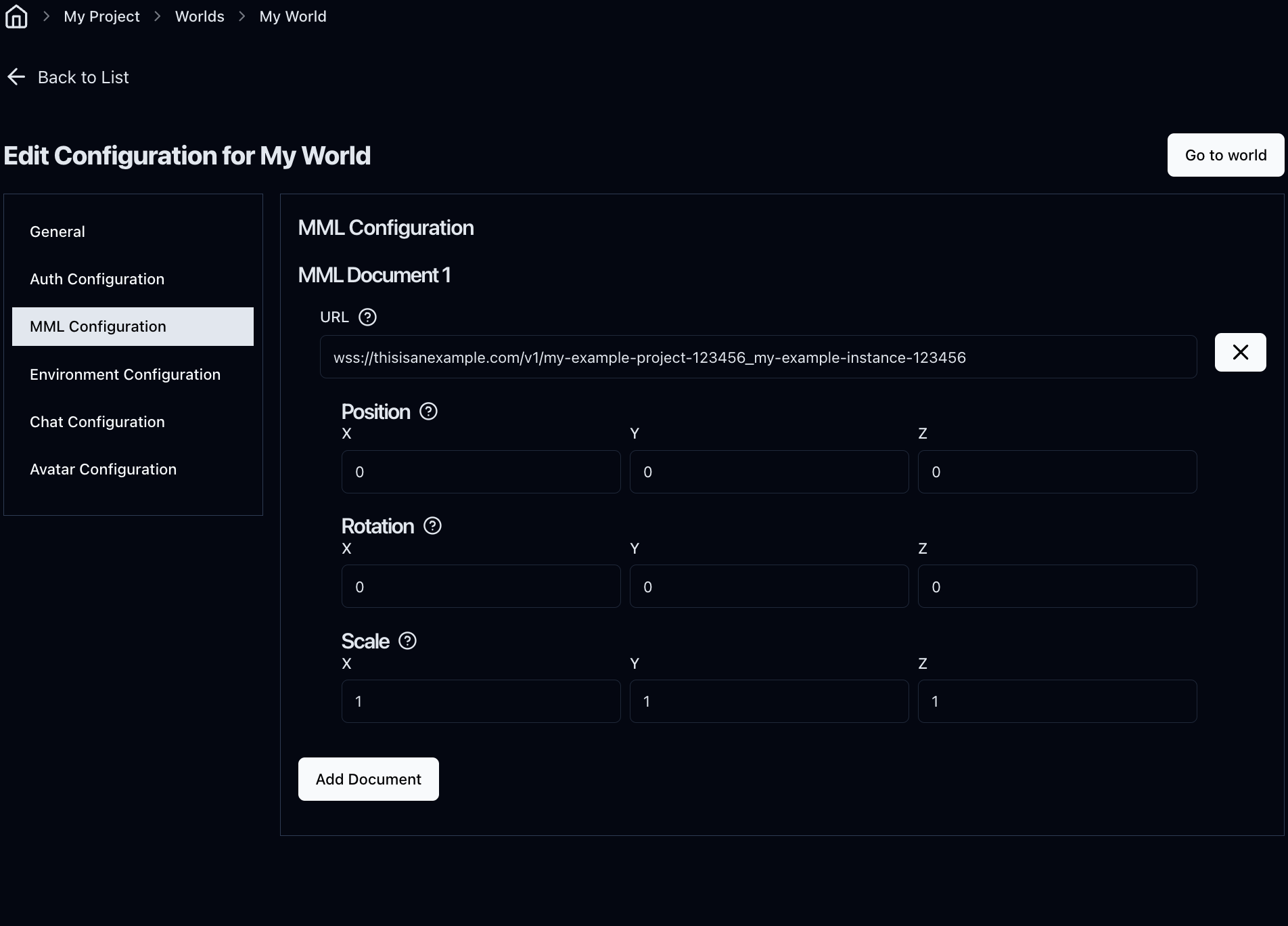 On the configuration page, click MML Configuration from the menu on the left, and finally, Add Document; paste your MML URL in the URL input box and save.