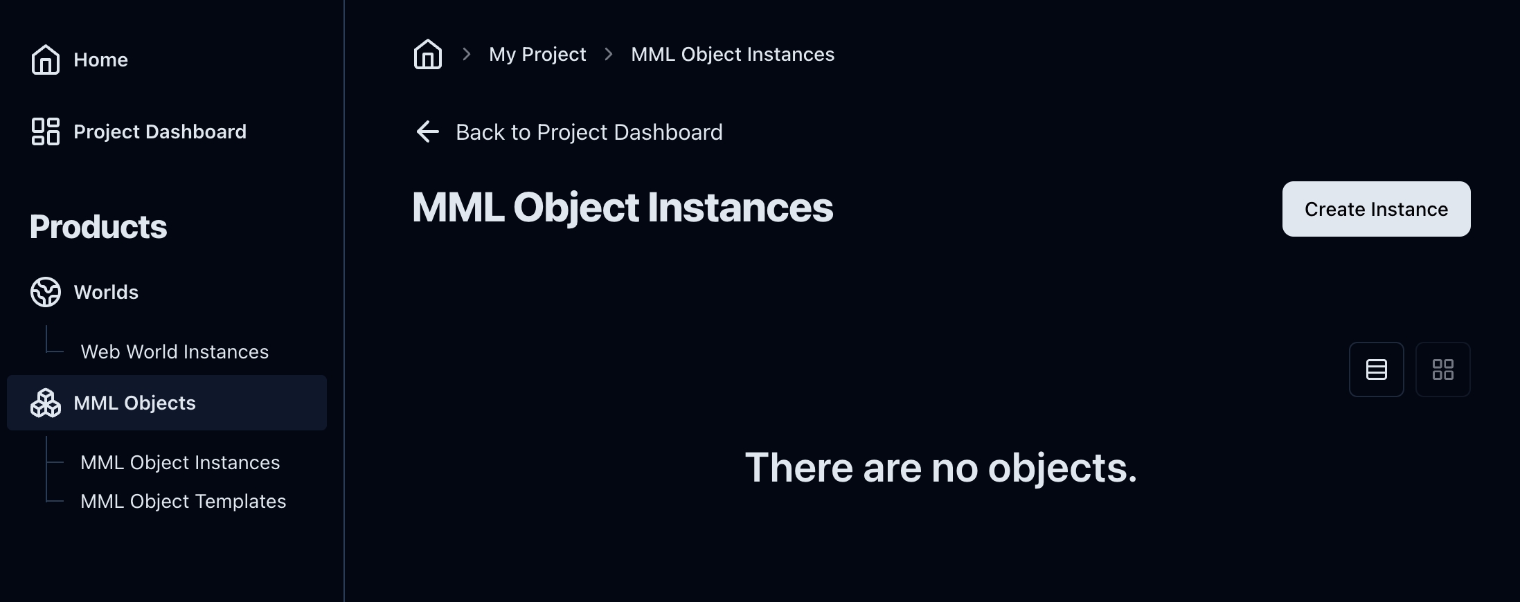 You can create an MML Object Instance from the MML Object Instance dashboard. You can get there in your Project Dashboard by clicking MML Object Instances on the menu on the left.
