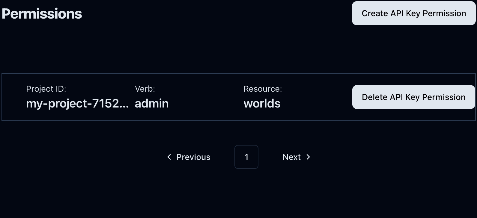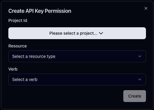 You will be in the API Key dashboard. Click Create API Key Permission, and a modal will appear. Here, you can choose Project ID, Resource, and Verb. You won't be able to modify the permission after creating it.