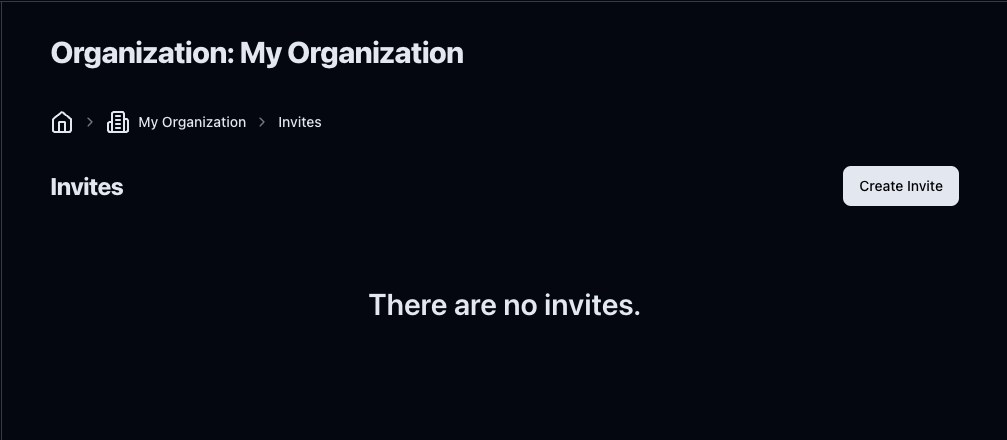 To add members to your organization, you have to invite them. To do that, you can go to the Organization dashboard and click the Create Invite button.