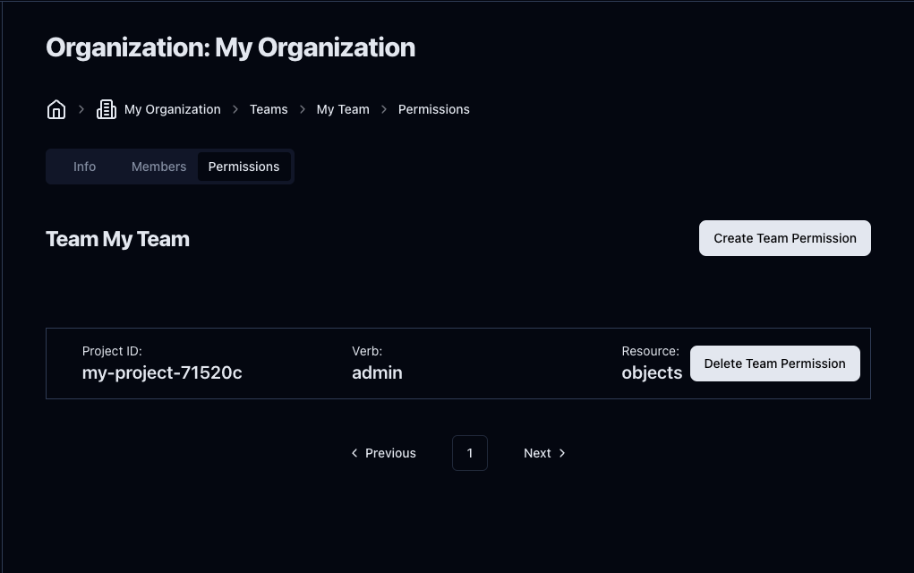 After creating a permission, you will see it listed in the team permissions dashboard