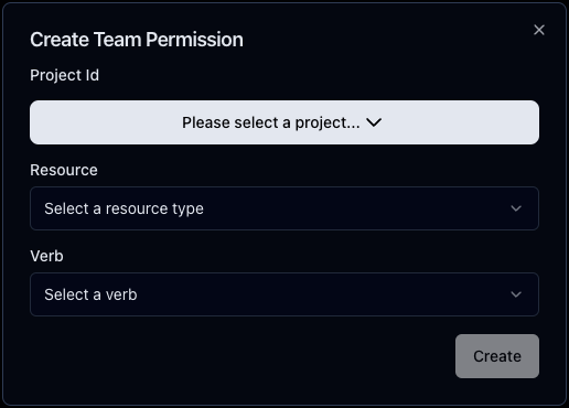 Click Create Team Permissions, and a modal will pop up. Here, you can select the project, resource, and verb.