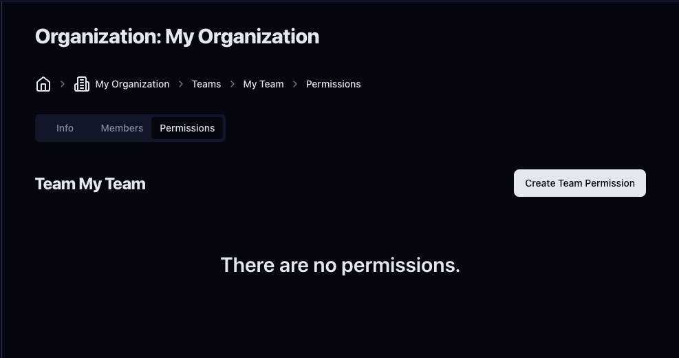 To create team permissions, click on the team you would like to add permissions to from the list of teams and click Permissions from the tabs below the Organization name and breadcrumbs.